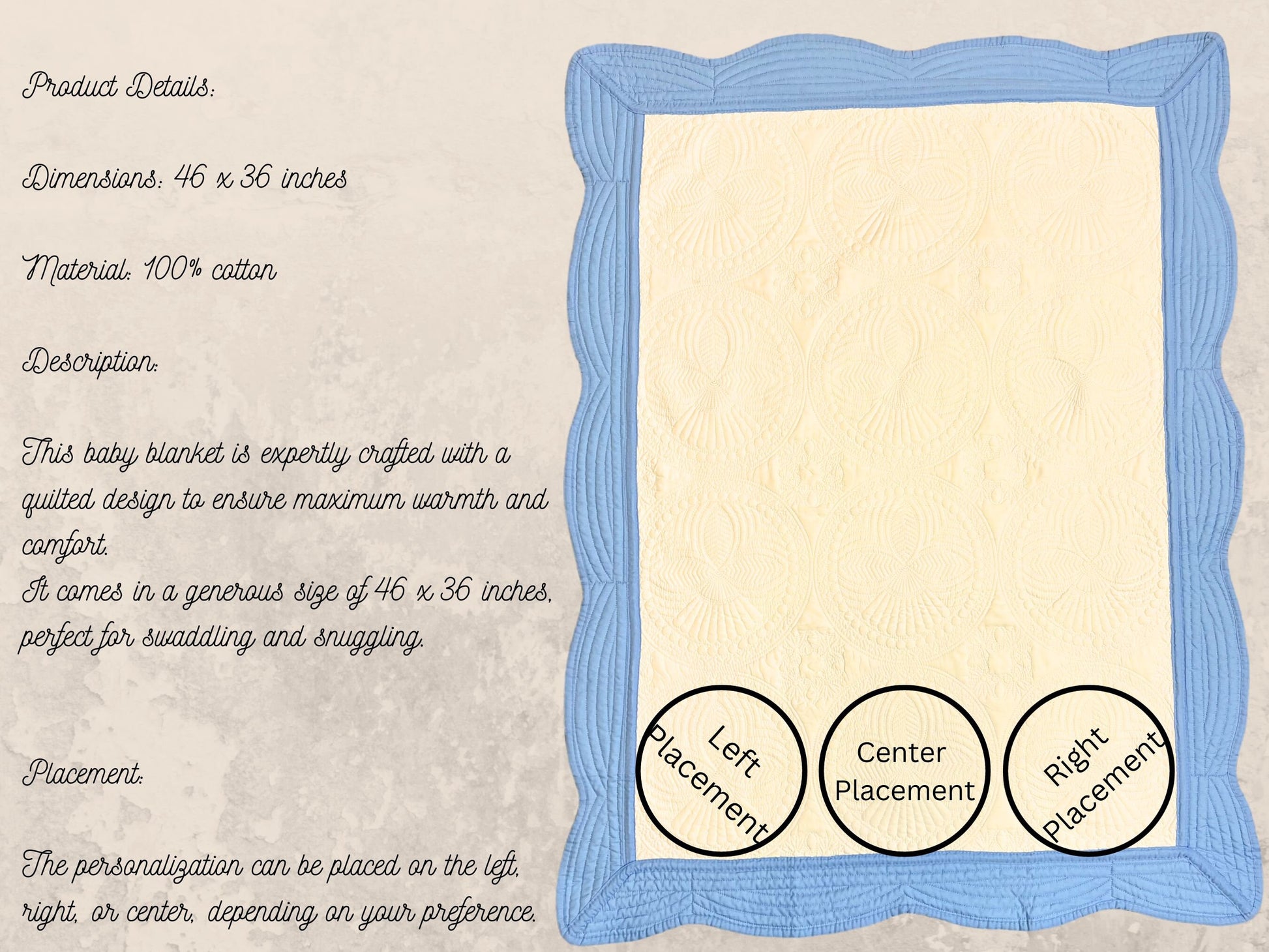 Crafted with the utmost care, this quilt is more than just a blanket; it's a timeless keepsake awaiting the details that make it uniquely yours. Personalize it with your baby's birth stats, their name, or a custom message, transforming this cozy quilt into a cherished memento that tells a story of new beginnings.